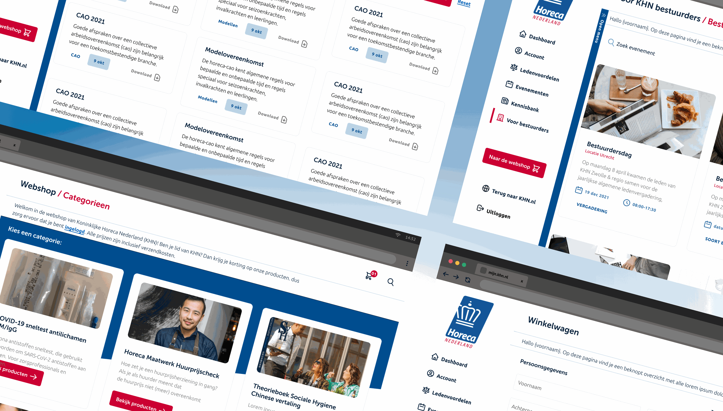 Het design van mijn.khn.nl is gericht op maximale functionaliteit en gebruiksgemak voor de horecaondernemers. Dit resulteert in een heldere en frisse uitstraling, met duidelijke blokken en knoppen die directe toegang bieden tot relevante informatie. Het platform is onderverdeeld in drie hoofdthema's: "Blijf 24/7 op de hoogte" voor informatie over trends, regelgeving en ontwikkelingen in de horeca; "Neem deel aan evenementen" voor beurzen, conferenties en netwerkbijeenkomsten; en "Voordelen afsluiten" voor financiële en arbeids voordelen zoals kortingen, bonussen en flexibele werktijden.